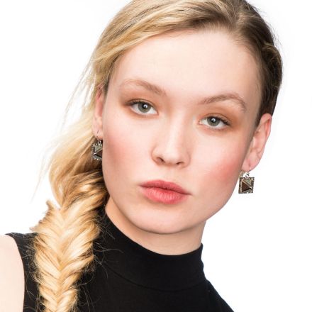 Arete Latón con baño Plata y Piedras de Labadorite y Cristal.