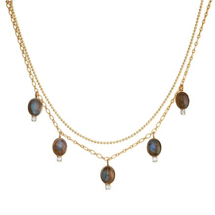 Collar Latón con baño de Oro 14kt. Piedras Labroradite y Swarovski.