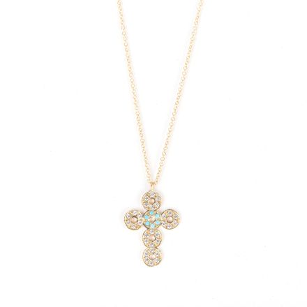 Dije Cruz Griego Oro de 14kt con Topacio blanco y Turquesa.