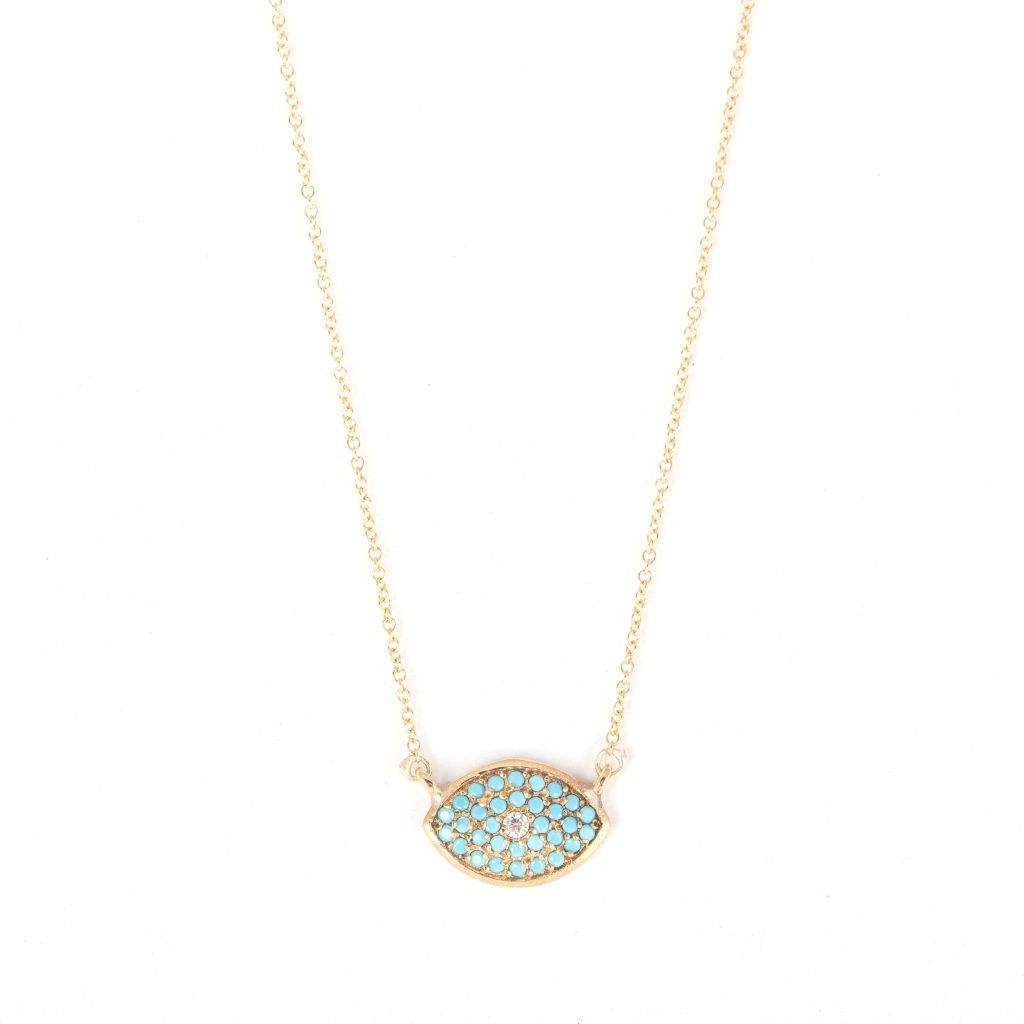 Dije Ojo Griego Oro de 14kt con Turquesa y mini Topasio blanco.