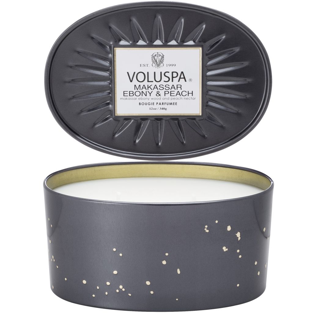 Makassar Ebony & Peach: Notes of solid Black Ebony Wood, Ripe Peaches, Apple Blossom. 12 oz / 340g